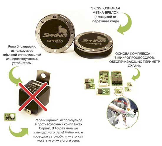 В отличие от сигнализаций и обычных противоугонных систем, электронная часть комплексов Спринг (иммобилайзер SPR.pro) полностью интегрируется в электронику автомобиля, образуя с ней единое целое! В системе нет какого-то одного центрального блока, при нахождении и удалении которого рушится вся охрана автомобиля. Комплексы cостоят из 3-х-8-ми микропроцессорных модулей, разнесённых по автомобилю, которые только вместе и образуют периметр охраны!
